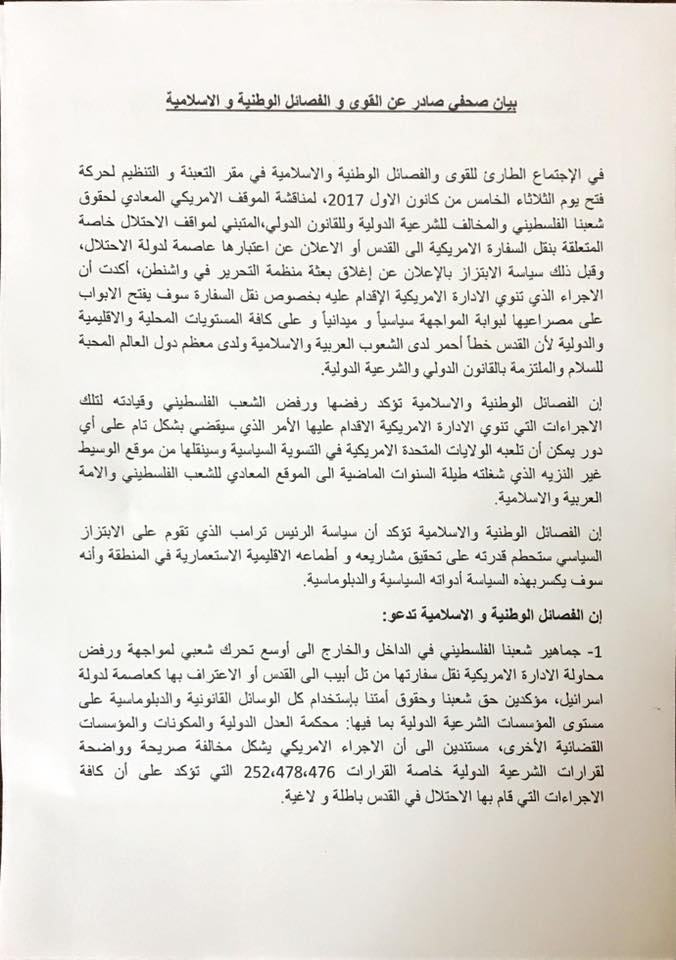1- جماهير شعبنا الفلسطيني في الداخل والخارج الى أوسع تحرك شعبي لمواجهة ورفض محاولة الادارة الامريكية نقل سفارتها من تل أبيب الى القدس أو الاعتراف بها كعاصمة لدولة اسرائيل، مؤكدين حق شعبنا وحقوق أمتنا بإستخدام كل الوسائل القانونية والدبلوماسية على مستوى المؤسسات الشرعية الدولية بما فيها: محكمة العدل الدولية والمكونات والمؤسسات القضائية الأخرى، مستندين الى أن الاجراء الامريكي يشكل مخالفة صريحة وواضحة لقرارات الشرعية الدولية خاصة القرارات 252،478،476 التي تؤكد على أن كافة الاجراءات التي قام بها الاحتلال في القدس باطلة و لاغية.