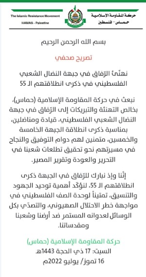 إنَّنا وإذ نبارك للرّفاق في الجبهة ذكرى انطلاقتهم الـ 55، لنؤكّد أهمية توحيد الجهود والتنسيق، تمتيناً لوحدة الصف الفلسطيني في مواجهة خطر الاحتلال الصهيوني، والتصدّي بكل الوسائل لعدوانه المستمر ضد أرضنا وشعبنا ومقدساتنا.