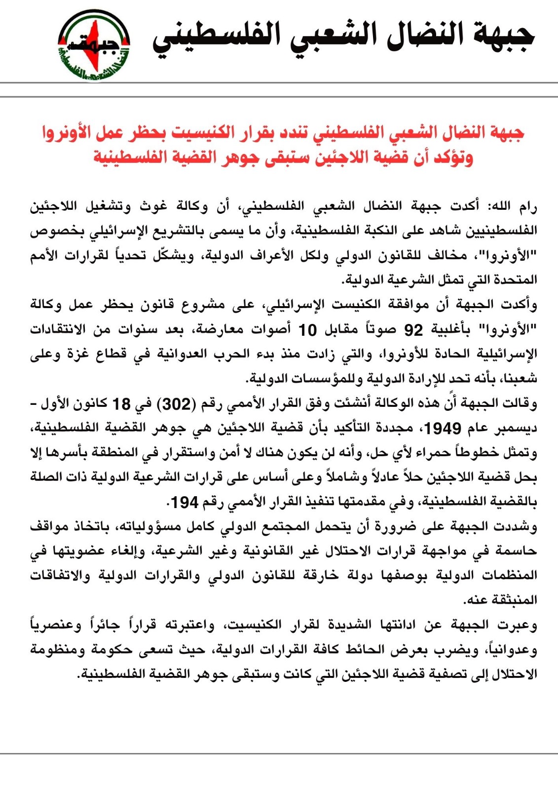 وعبرت الجبهة عن ادانتها الشديدة لقرار الكنيسيت، واعتبرته قراراً جائراً وعنصرياً وعدوانياً، ويضرب بعرض الحائط كافة القرارات الدولية، حيث تسعى حكومة ومنظومة الاحتلال إلى تصفية قضية اللاجئين التي كانت وستبقى جوهر القضية الفلسطينية.