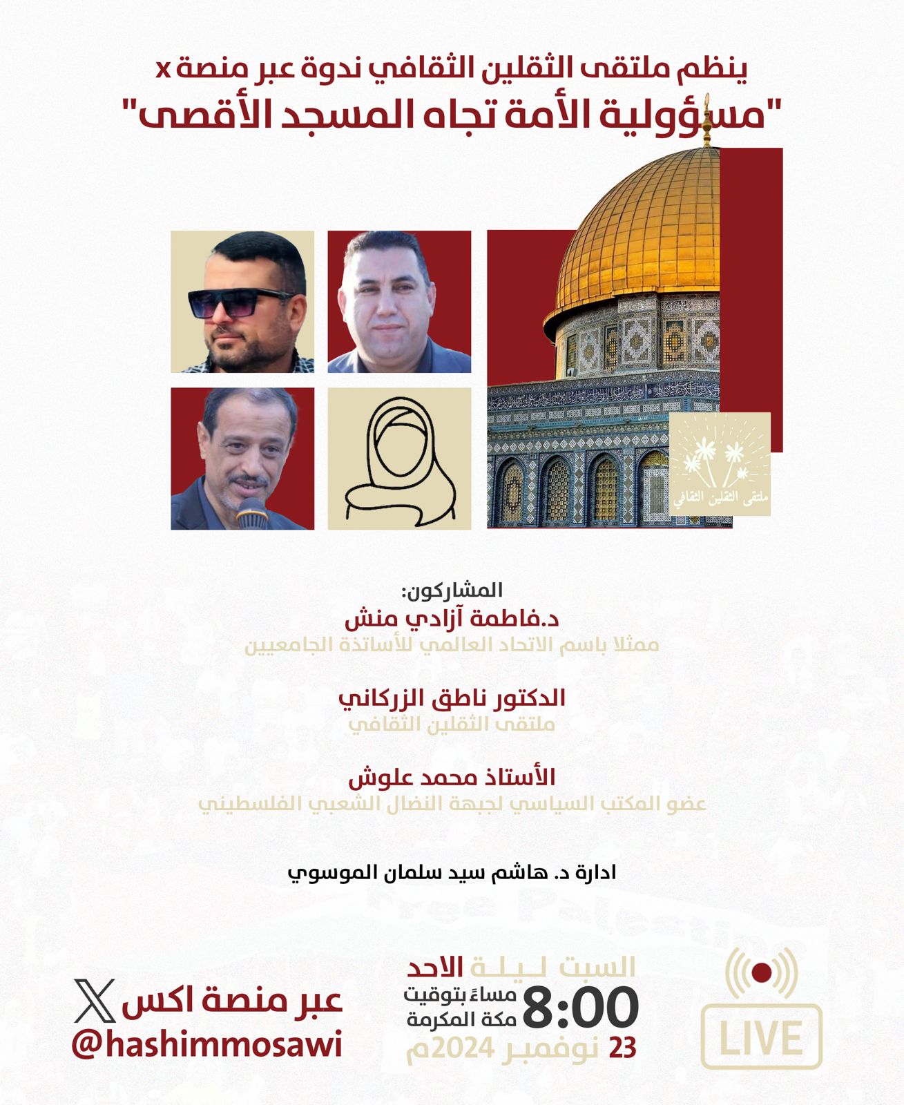 المنامة – رام الله: شارك عضو المكتب السياسي لجبهة النضال الشعبي الفلسطيني، الكاتب والشاعر محمد علوش، في ندوة افتراضية عبر منصة (X) نظمها ملتقى الثقلين الثقافي في البحرين، تحت عنوان: (مسؤولية الأمة تجاه المسجد الأقصى).