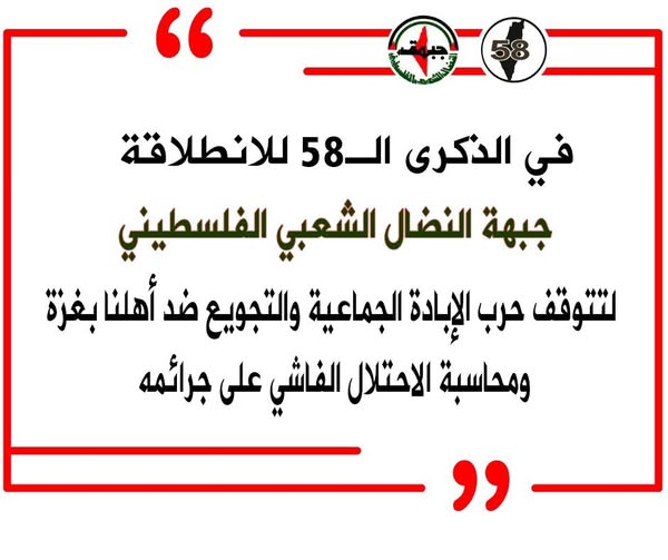 في الذكرى الثامنة والخمسين لانطلاقتها، من الطبيعي أن تُوجَّه التحية لأمين عام الجبهة الدكتور أحمد مجدلاني، وقيادتها وكوادرها الذين واصلوا العمل بصمت ومسؤولية رغم كل ما واجهته الحركة الوطنية من أزمات. كما يستحق أسرى الجبهة وجرحاها كل التحية، فهم الشاهد الحيّ على أن هذا الخيار لم يكن نظريًا، بل دُفع ثمنه من اللحم الحيّ. أما شهداؤها، فهم ليسوا أرقامًا في السجلات، بل جزء من الذاكرة الفلسطينية الحيّة، ومن نسيج نضال وطني واسع.