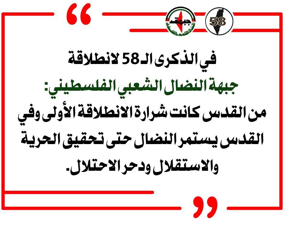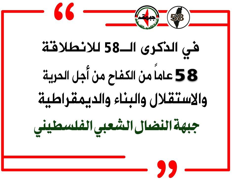 واضافت: 58عاماً من النضال، والجبهة إلى جانب كل القوى الحيّة وبين صفوف الجماهير، مع شعبنا البطل وهو يخوض معارك الدفاع عن قضيته الوطنية وحقوقه المشروعة وعن الأرض والهّوية والوجود، في مواجهة أشرس الحروب الهمجية التي تشنها دولة الاحتلال الفاشية وبدعم مباشر ومتواصل من قبل الإدارة الأمريكية، ويقدم شعبنا التضحيات الغالية ثابتاً على خياره التاريخي بالتمسك بالحقوق الوطنية العادلة والمشروعة وبالنضال بكل أشكاله، من أجل انتزاع حقوقنا الوطنية المشروعة، وتقرير المصير، وإقامة الدولة الفلسطينية المستقلة، وكاملة السيادة وعاصمتها القدس، على خطوط الرابع من حزيران 1967، وتطبيق القرارات الدولية وعلى رأسها القرار الأممي 194، الذي يكفل للاجئين من أبناء شعبنا، حقهم الثابت في العودة إلى ديارهم وممتلكاتهم التي هجروا منها قسراً، منذ نكبة العام 1948 .