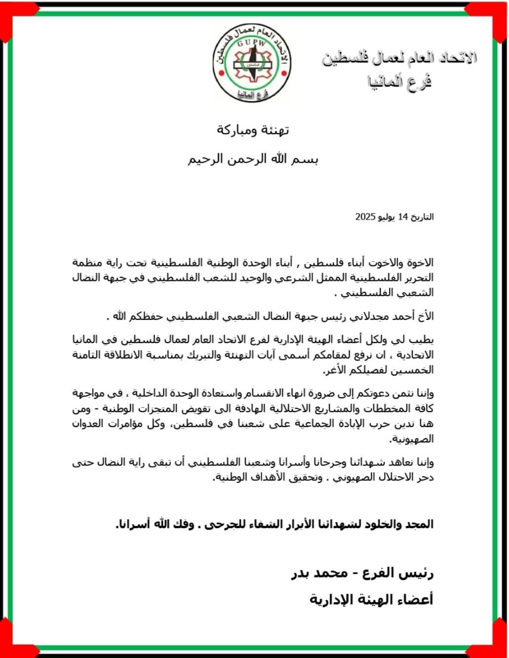 اخبار الجبهةمواضيع مميزة تهنئة بمناسبة ذكرى الانطلاقة ال “58” لجبهة النضال الشعبي من الاتحاد العام لعمال فلسطين فرع المانيا 2025/07/15 FacebookTwitterPinterestWhatsApp