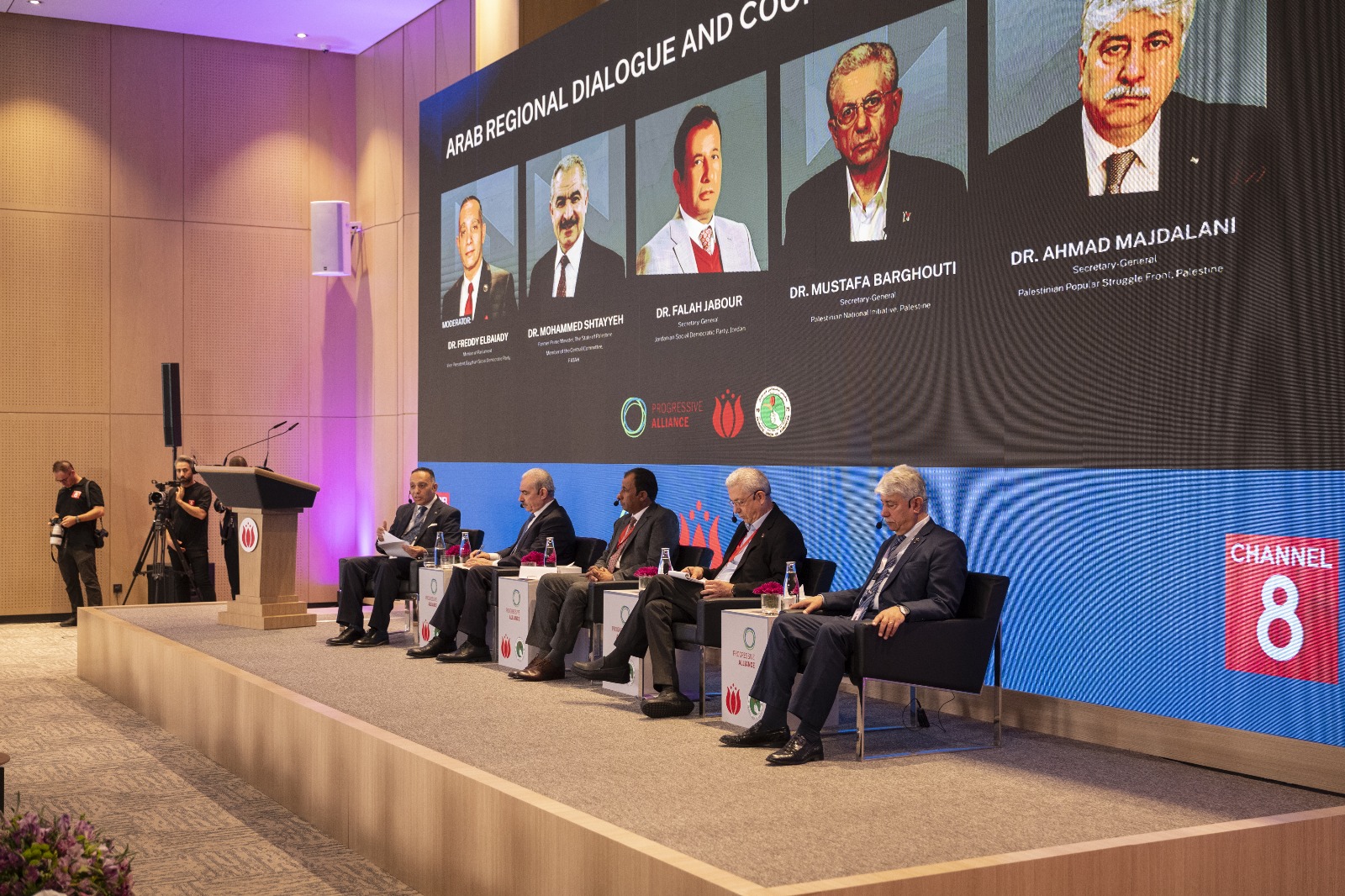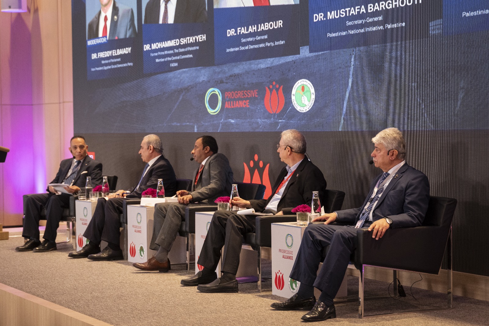 وشارك في الندوة: د. أحمد مجدلاني الأمين العام لجبهة النضال الشعبي الفلسطيني، ود. محمد اشتية عضو اللجنة المركزية لحركة فتح، ود. مصطفى البرغوثي الأمين العام لحركة المبادرة الوطنية الفلسطينية، ود. فلاح جبور الأمين العام للحزب الاجتماعي الديمقراطي الأردني، فيما أدار الجلسة د. فريدي البياضي نائب رئيس الحزب المصري الديمقراطي الاجتماعي.
