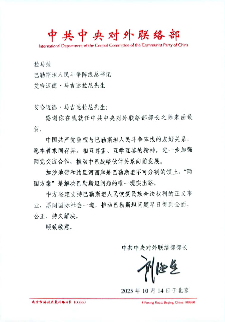 وختم الوزير الصيني رسالته بالتقدير والاحترام للأمين العام أحمد مجدلاني، متمنياً استمرار العلاقات الودية بين الحزبين والشعبين الصيني والفلسطيني.