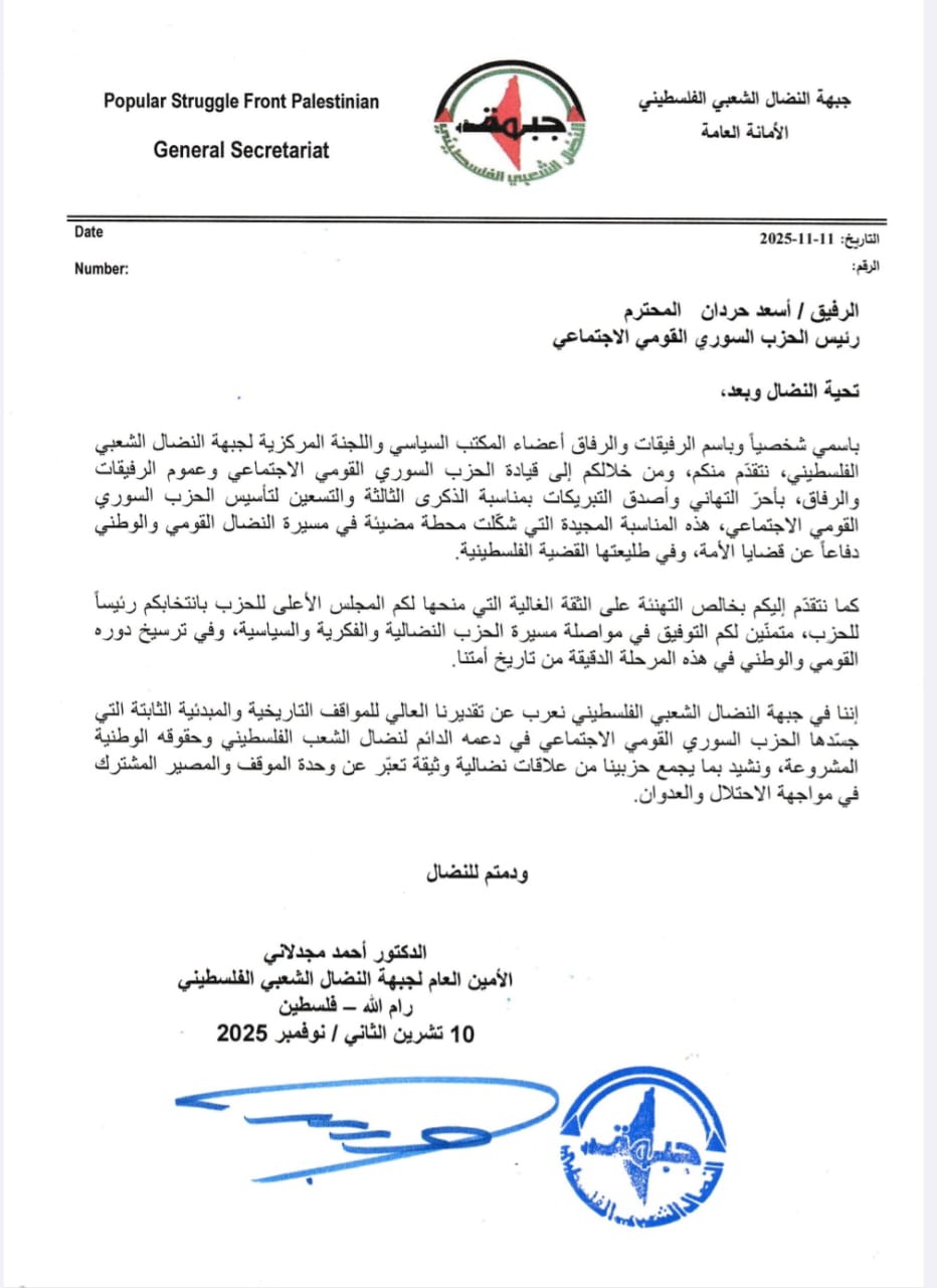 وخلال اللقاء سلم الرفيق جورج برقية تهنئة للدكتور جاك رستم، من الأمين العام للجبهة الدكتور أحمد مجدلاني إلى رئيس الحزب اسعد حردان لمناسبة التأسيس.