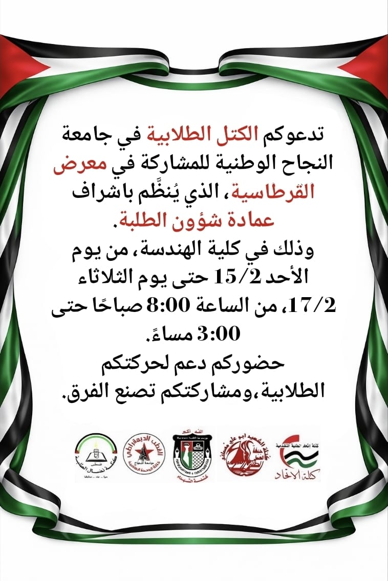 وجددت الكتلة تأكيدها على استمرارها في إطلاق وتنفيذ مبادرات طلابية نوعية تسهم في دعم المسيرة التعليمية، وترسخ قيم العمل الجماعي والانتماء الوطني داخل أسوار جامعة النجاح الوطنية.