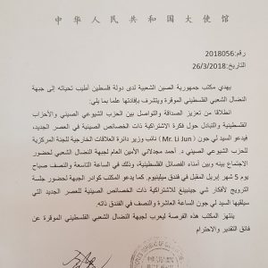 وسلم الوفد د. مجدلاني دعوة رسمية للمشاركة في اللقاء مع وفد دائرة العلاقات الخارجية للحزب الشيوعي الصيني الذي سيزور دولة فلسطين يوم 5 ابريل القادم ، برئاسة نائب وزير دائرة العلاقات الخارجية للجنة المركزية للحزب الشيوعي الصيني لي جون ، حي سيلتقي مع الاحزاب الفلسطينية، من أجل تعزيز الصداقة والتواصل الفلسطيني الصيني، كما أنه سيعقد جلسة للحديث مع كوادر الاحزاب الفلسطينية حول الاشتراكية ذات الخصائص الصينية .