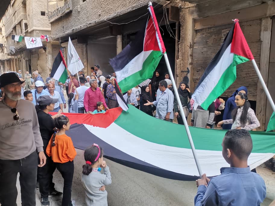 وخلال الوقفة التي شارك بها ايضا فعاليات وهيئات ومنظمات أهلية واجتماعية ودينية سورية وفلسطينية تم رفع الأعلام الوطنية واللافتات وترديد الأشعار والأناشيد التي تؤكد التضامن مع أهلنا بقطاع غزة الذي يتعرض لمجازر يندى لها التاريخ امام الصمت الدولي المتواطئ مع الجرائم لوحشية الممنهجة التي يرتكبها كيان الاحتلال في القطاع.