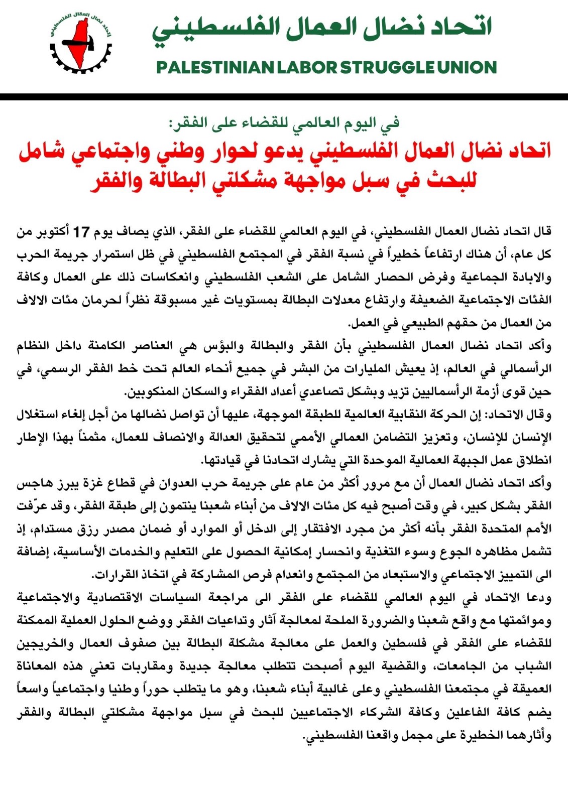 ودعا الاتحاد في اليوم العالمي للقضاء على الفقر الى مراجعة السياسات الاقتصادية والاجتماعية وموائمتها مع واقع شعبنا والضرورة الملحة لمعالجة آثار وتداعيات الفقر ووضع الحلول العملية الممكنة للقضاء على الفقر في فلسطين والعمل على معالجة مشكلة البطالة بين صفوف العمال والخريجين الشباب من الجامعات، والقضية اليوم أصبحت تتطلب معالجة جديدة ومقاربات تعني هذه المعاناة العميقة في مجتمعنا الفلسطيني وعلى غالبية أبناء شعبنا، وهو ما يتطلب حوراً وطنيا واجتماعياً واسعاً يضم كافة الفاعلين وكافة الشركاء الاجتماعيين للبحث في سبل مواجهة مشكلتي البطالة والفقر وأثارهما الخطيرة على مجمل واقعنا الفلسطيني.