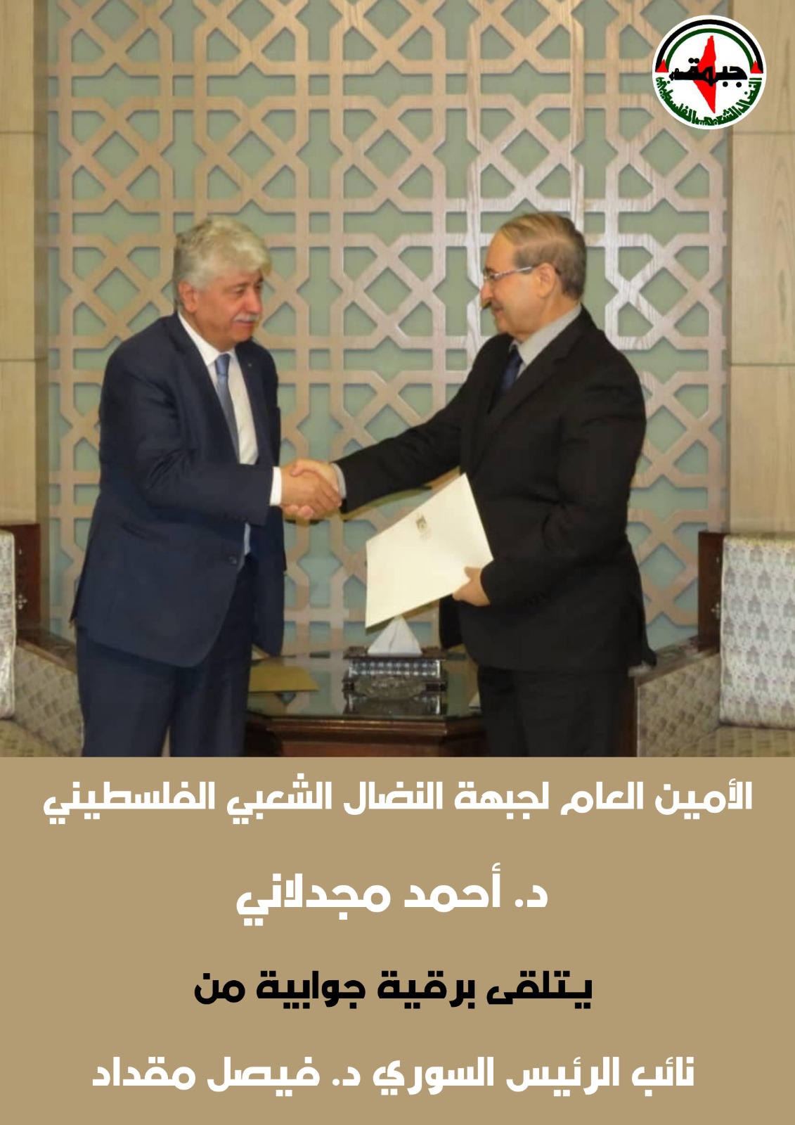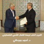 رام الله: تلقى د. أحمد مجدلاني، عضو اللجنة التنفيذية لمنظمة التحرير الفلسطينية، الأمين العام لجبهة النضال الشعبي الفلسطيني، برقية جوابية من نائب الرئيس السوري د. فيصل مقداد، رداً على برقية كان قد وجهها الأمين العام مهنئاً د. مقداد بتوليه منصب نائب رئيس الجمهورية العربية السورية.