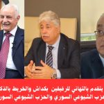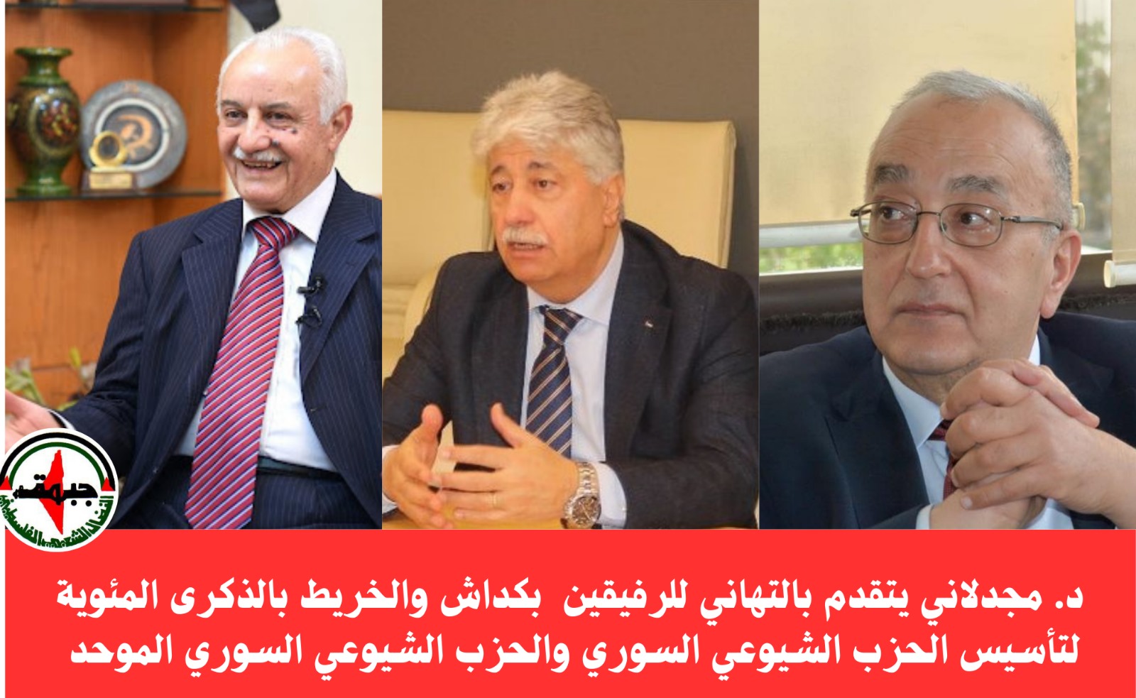 رام الله: قدم الأمين العام لجبهة النضال الشعبي الفلسطيني د. أحمد مجدلاني، تهانيه الحارة، للرفيقين الدكتور عمار بكداش، ونجم الدين الخريط، بمناسبة الذكرى المئوية لتأسيس وانطلاقة الحركة الشيوعية السورية.