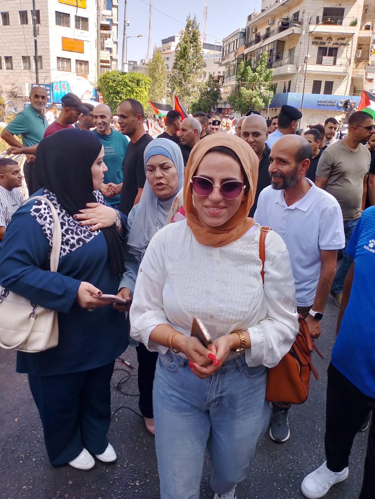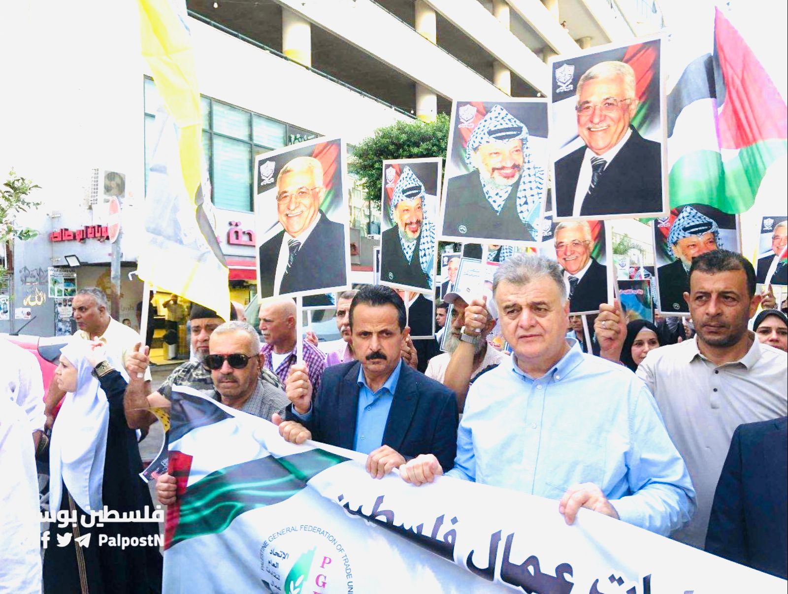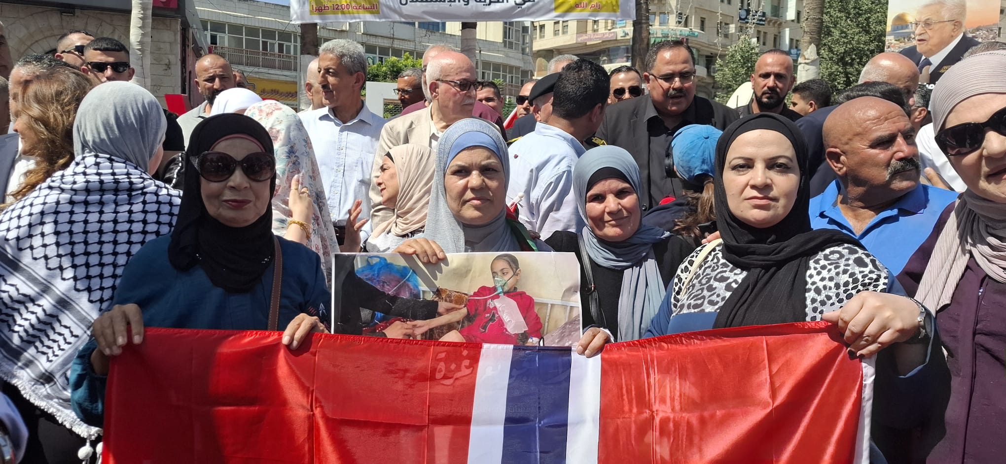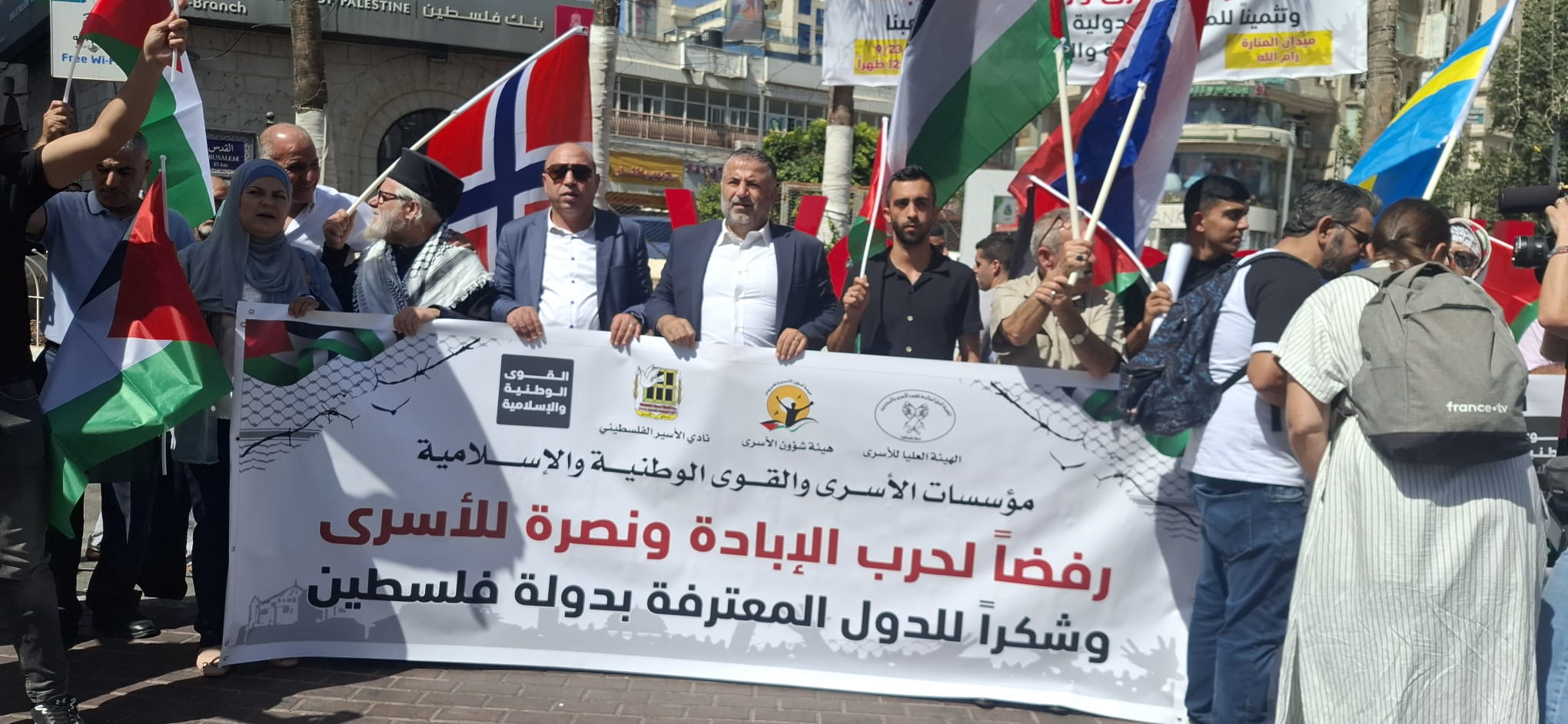 ورُفع خلال المسيرة العلم الفلسطيني إلى جانب إعلام الدول التي أعلنت مؤخراً اعترافها بدولة فلسطين، وصور للرئيس محمود عباس.