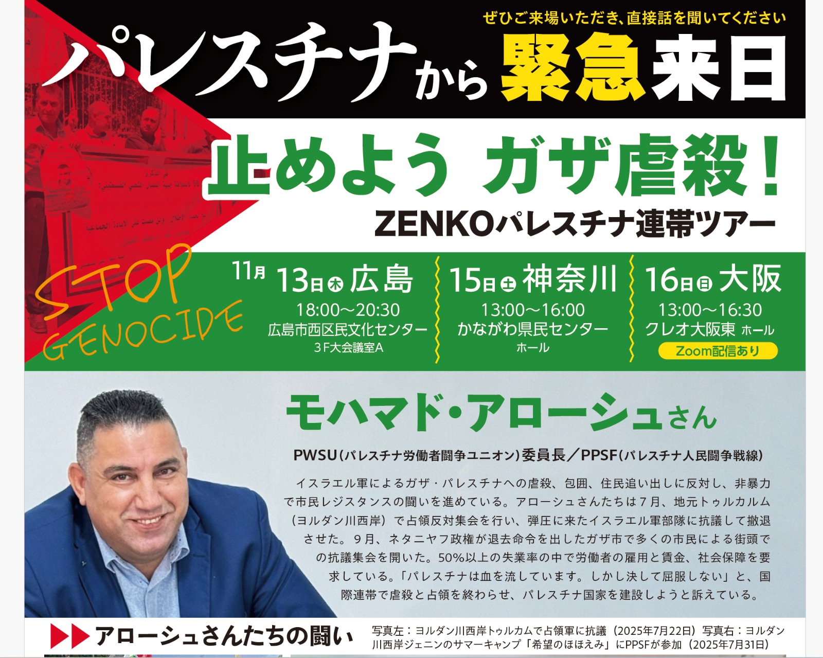رام الله: غادر اليوم عضو المكتب السياسي لجبهة النضال الشعبي الفلسطيني محمد علوش الأراضي الفلسطينية متوجهاً إلى اليابان، بدعوة رسمية من منظمة زينكو (الجمعية الوطنية من أجل السلام والديمقراطية)، وذلك للمشاركة في جولة محاضرات ولقاءات جماهيرية ستقام في طوكيو وفي عدد من المدن اليابانية، من بينها هيروشيما، يوكوهاما، وأوساكا.