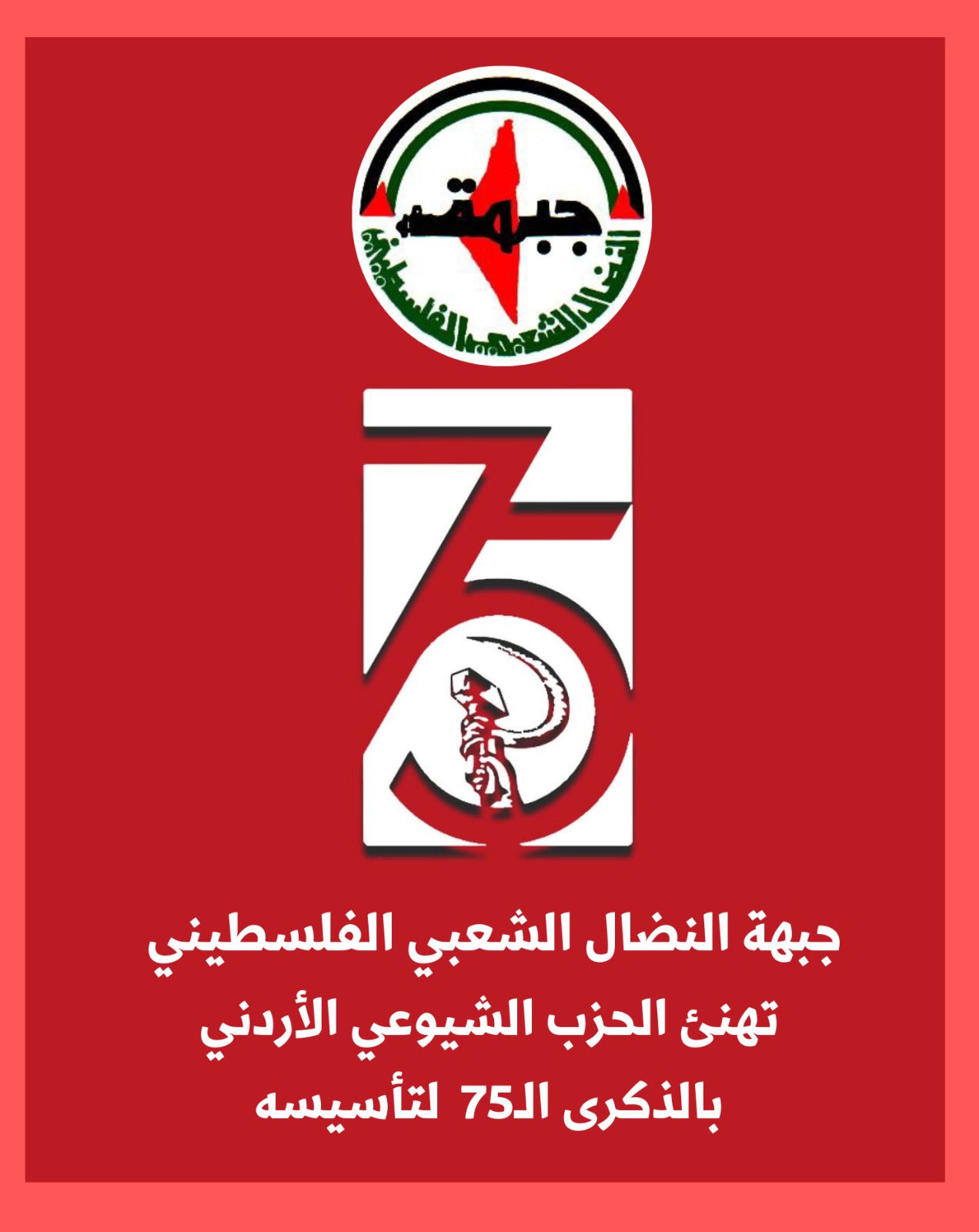رام الله: وجّه الأمين العام لجبهة النضال الشعبي الفلسطيني، د. أحمد مجدلاني، برقية تهنئة رفاقية إلى الرفيق فهمي الكتوت، الأمين العام للحزب الشيوعي الأردني، بمناسبة الذكرى الخامسة والسبعين لتأسيس الحزب، معرباً باسمه وباسم أعضاء المكتب السياسي واللجنة المركزية للجبهة، عن أحرّ التهاني والتبريكات لقيادة وكوادر ومناضلات ومناضلي الحزب الشيوعي الأردني، ومؤكداً أن هذه الذكرى تمثّل محطة كفاحية مضيئة في تاريخ الحركة الشيوعية والوطنية الأردنية، لما قدّمه الحزب على امتداد عقود من نضالٍ صلب دفاعاً عن العدالة الاجتماعية والديمقراطية وحقوق العمال والكادحين، ومواجهة سياسات التبعية والهيمنة.