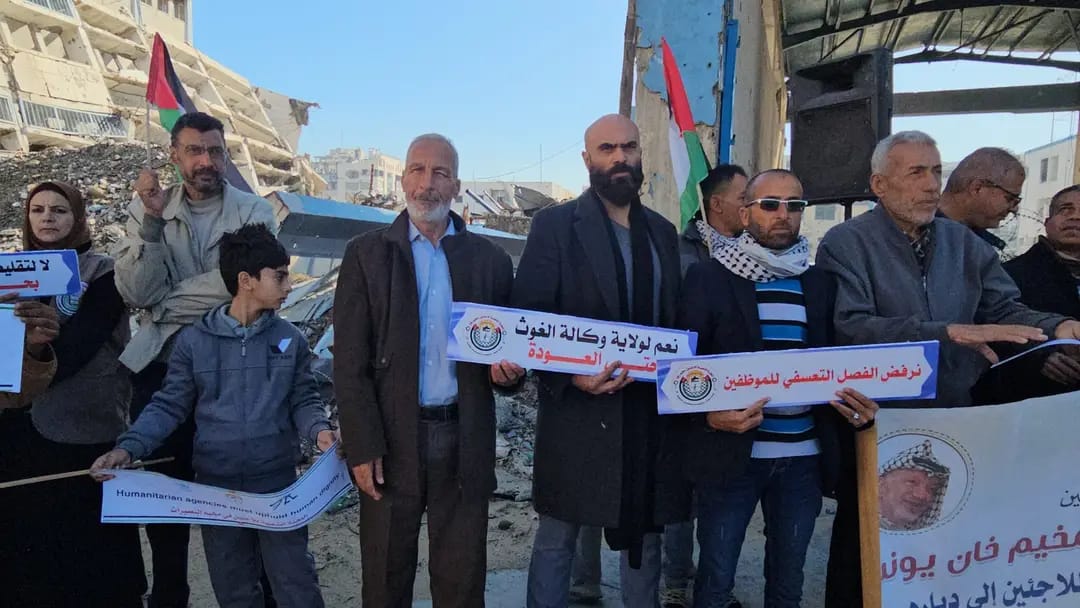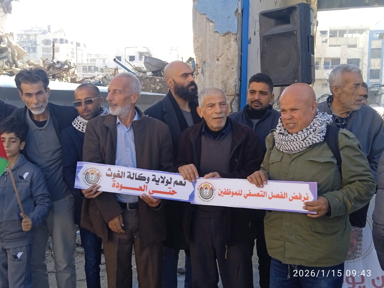 بحضور محمود الزق عضو المكتب السياسي للجبهة ومشاركة الرفاق جهاد أحمد وأحمد السباح ومعين أبو نحل ورفعت فوره ومحمد العرجا وفايز ثابت ومشاركة العديد من الشخصيات الوطنية، وممثلي الفصائل حول القرار الصادر عن إدارة الوكالة، والقاضي بتقليص عدد ساعات العمل الأسبوعية من 37.5 ساعة إلى 30 ساعة، وما يترتب عليه من خفضٍ في الرواتب بنسبة تقارب 20%حاملين الشعارات التى تطالب برفض هذا القرار الجائر الذى يمس حقوق الموظفين وضد الاجراءات بفصل مايقارب 600 موظف ممن سافر للخارج .