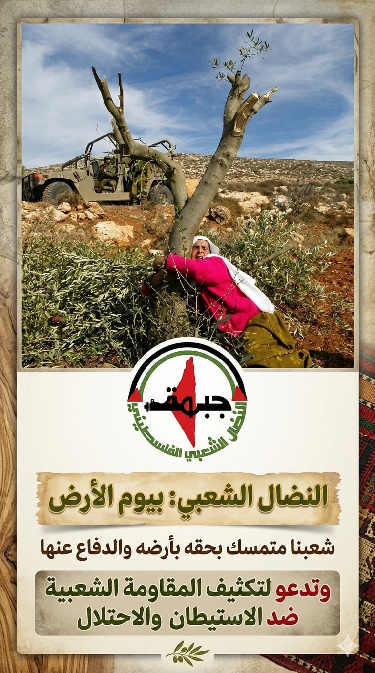 وقالت الجبهة : تأتي ذكرى يوم الأرض هذا العام وشعبنا يواجه تحديات جسام ؛ فحكومة الاحتلال الفاشية ما زالت ماضية في سياستها الإرهابية وتحديها للمجتمع الدولي ولقرارات الشرعية الدولية ، وتواصل نهب الأراضي وتهجير السكان ، والعدوان وجرائم الإبادة الجماعية في غزة.
